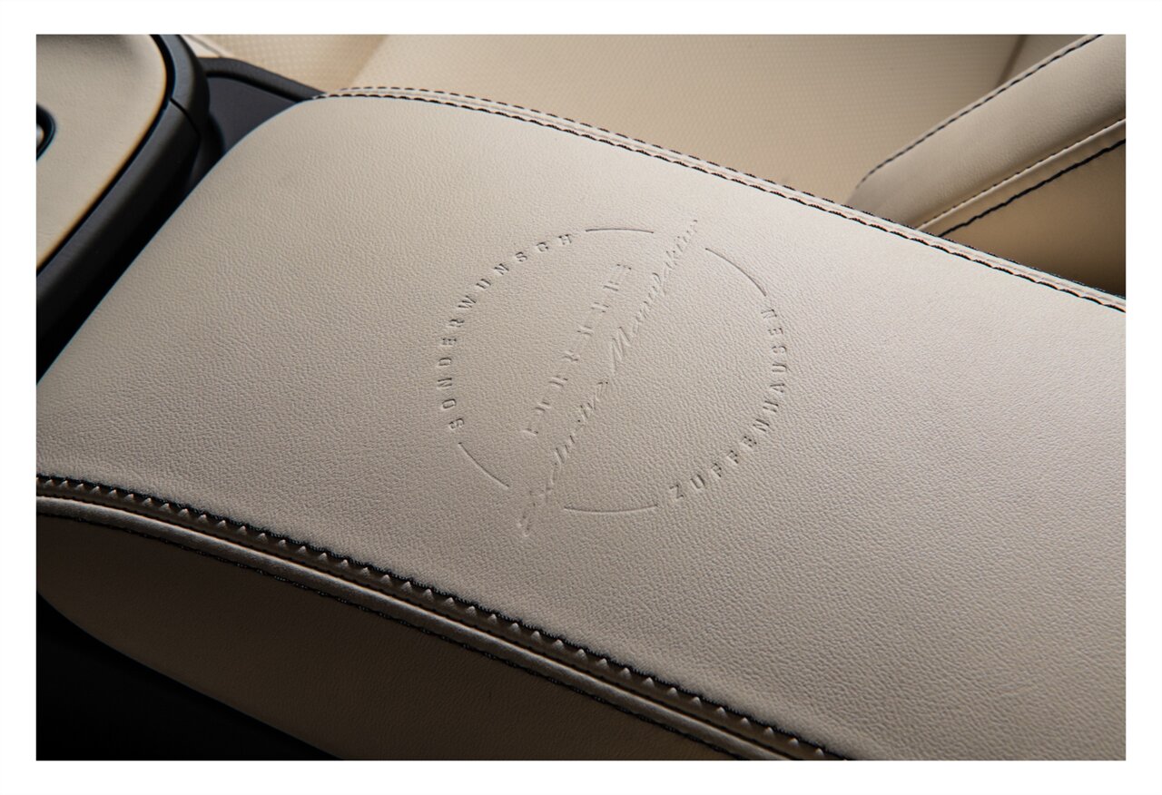 Storage Bin Lid Center Console Cream Leather & Black Stitching w/ Embossed Sonderwunsch Logo